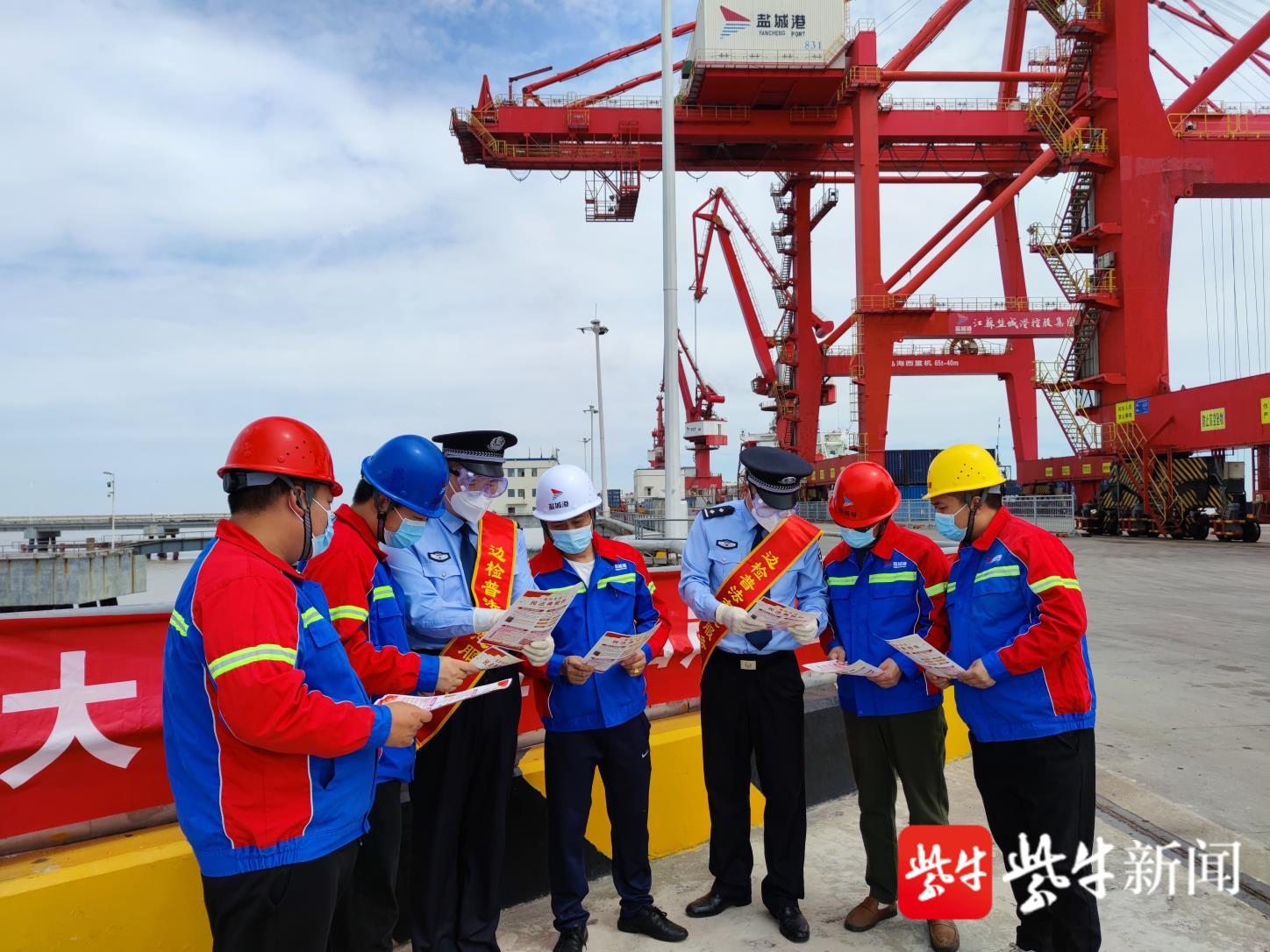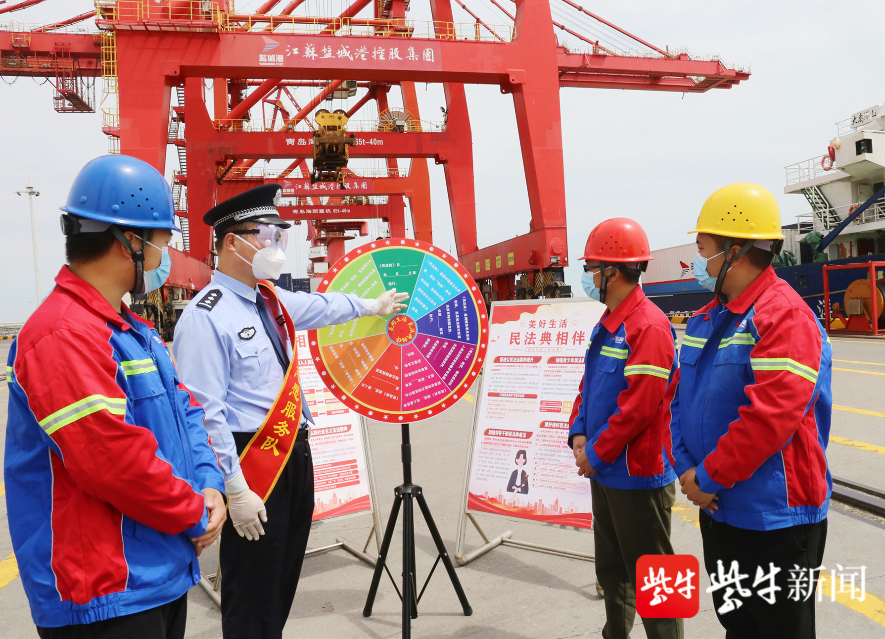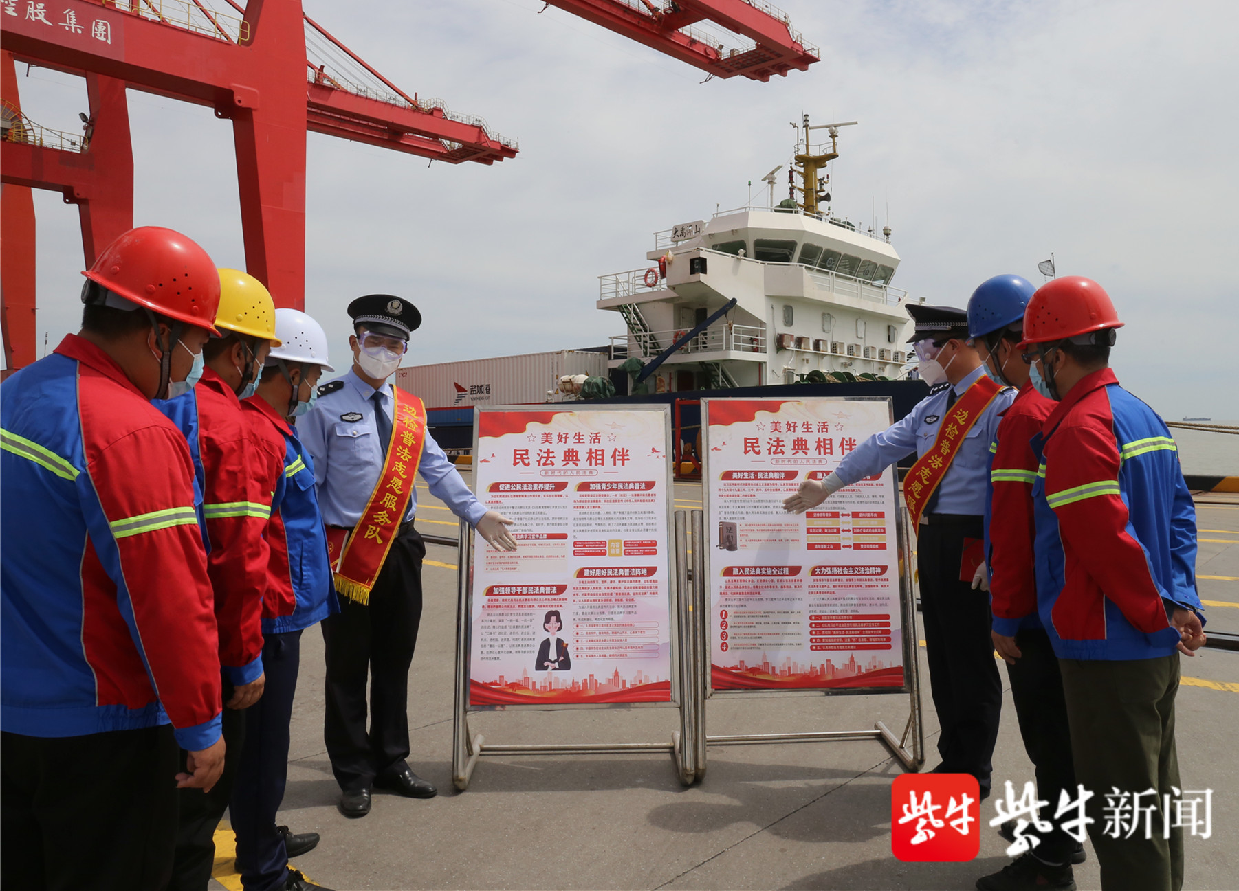 为切实提高码头一线工人的维权守法意识和知法用法能力,5月27日上午,江苏盐城出入境边防检查站组织普法小分队,顶着炎炎热日来到a片免费看大丰港区集装箱码头,开展“美好生活·民法典相伴”主题宣传活动,提升码头一线工人守法意识和学法热情。