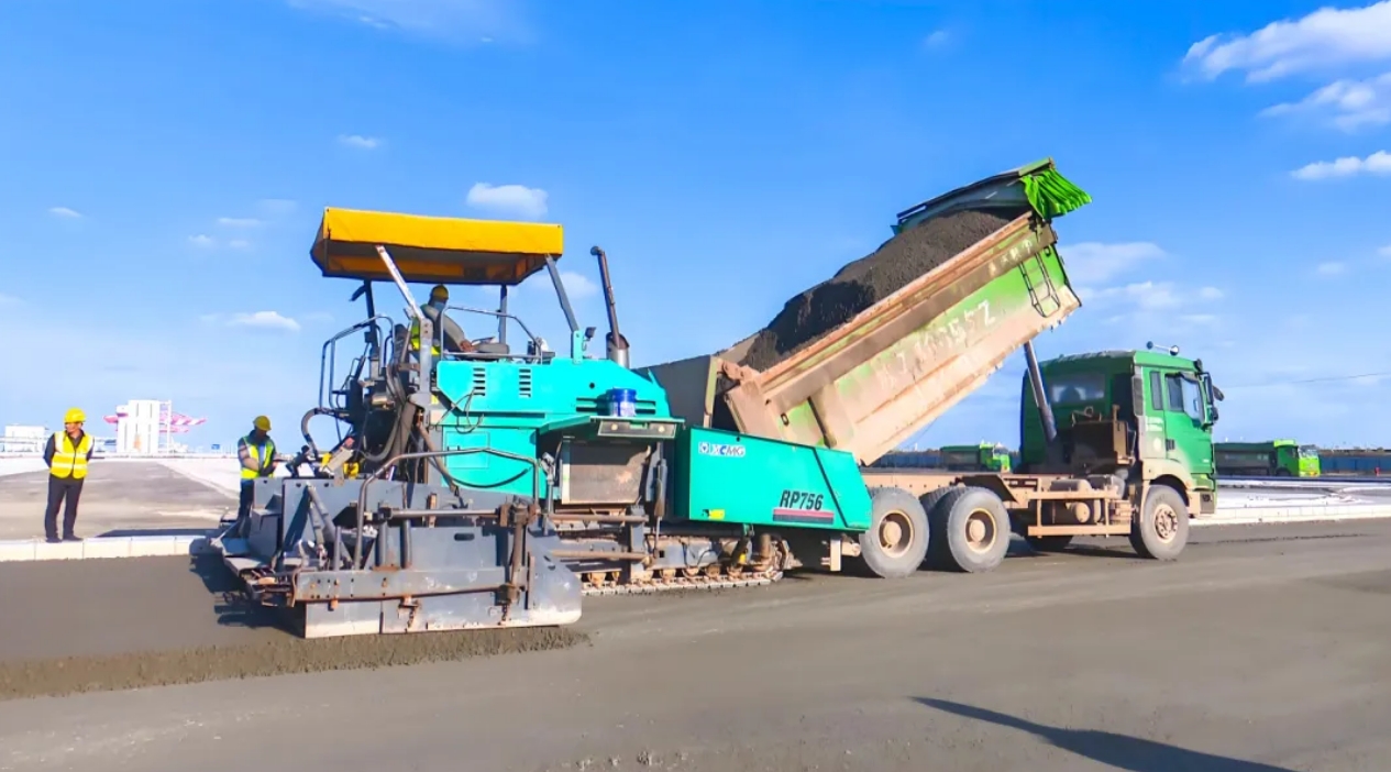 运输车正繁忙地将水泥稳定碎石