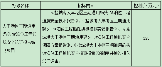 4、招标内容:大丰港区三期通用码头3#泊位工程通航安全论证报告编制,具体内容详见招标需求。