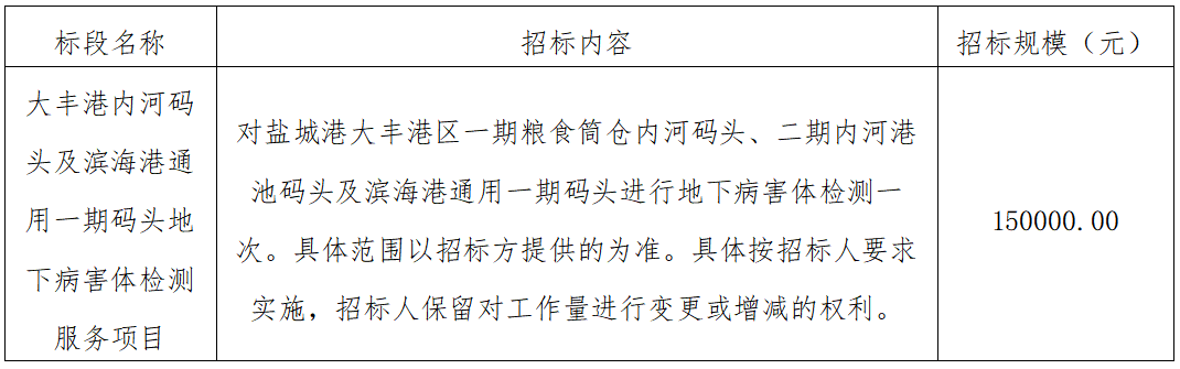 4、招标内容:对a片免费看大丰港区一期粮食筒仓内河码头、二期内河港池码头及滨海港通用一期码头进行地下病害体检测一次。