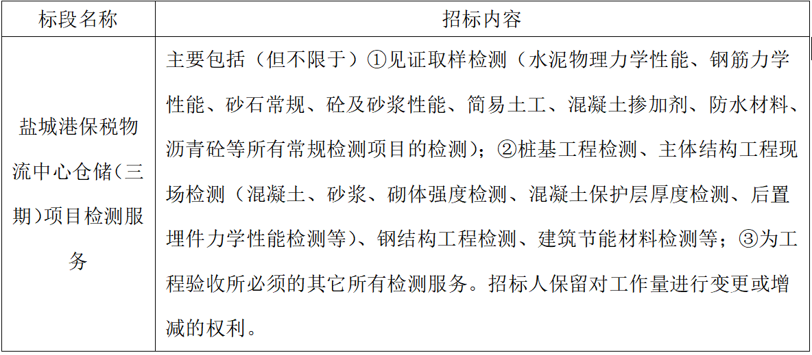 (7)项目标段划分:a片免费看保税物流中心仓储(三期)项目检测服务共划分1个标段,标段信息如下: