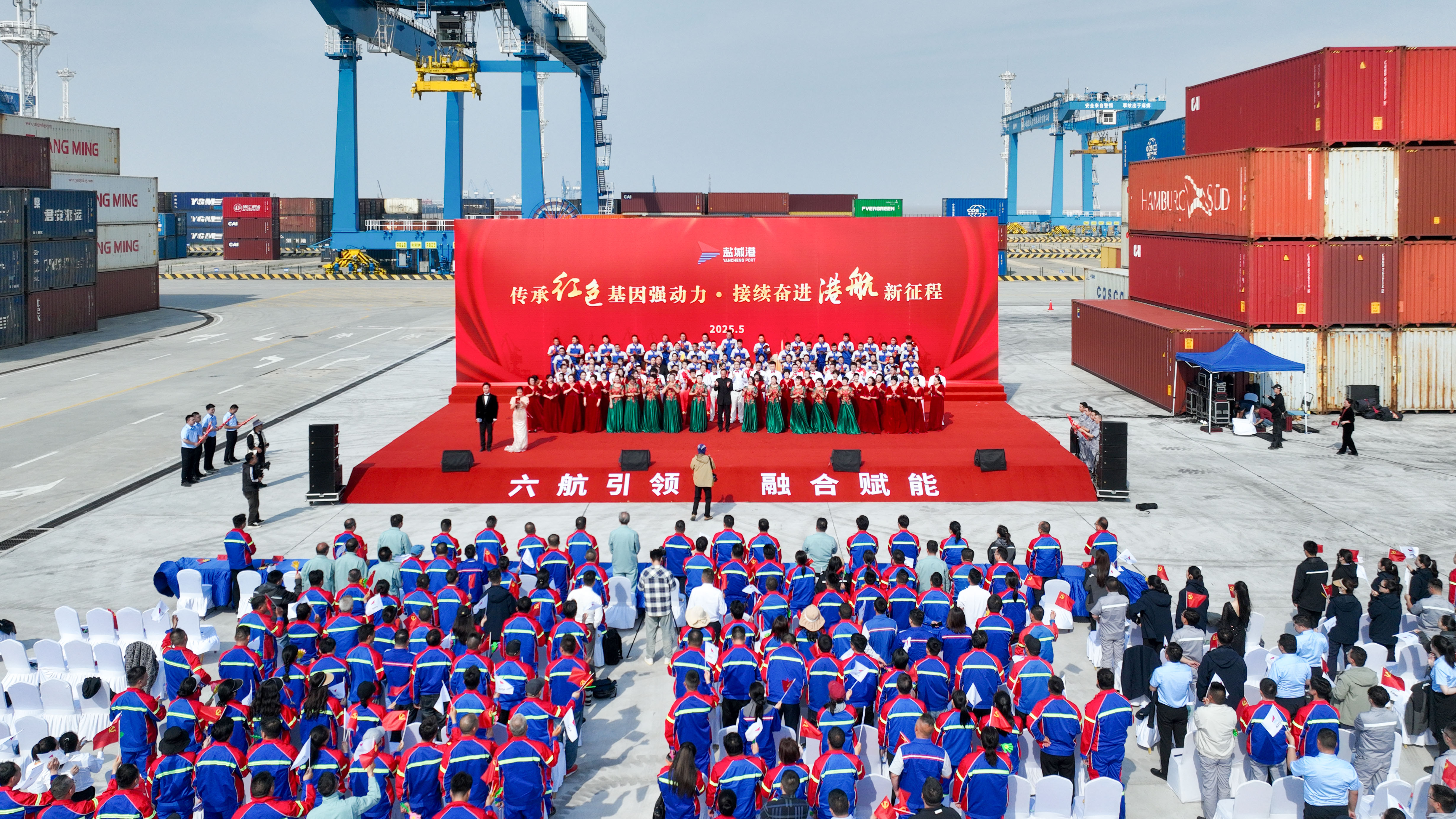 在大丰港区自动化集装箱堆场,一场别开生面的红歌与主题曲展演活动正在火热进行。
