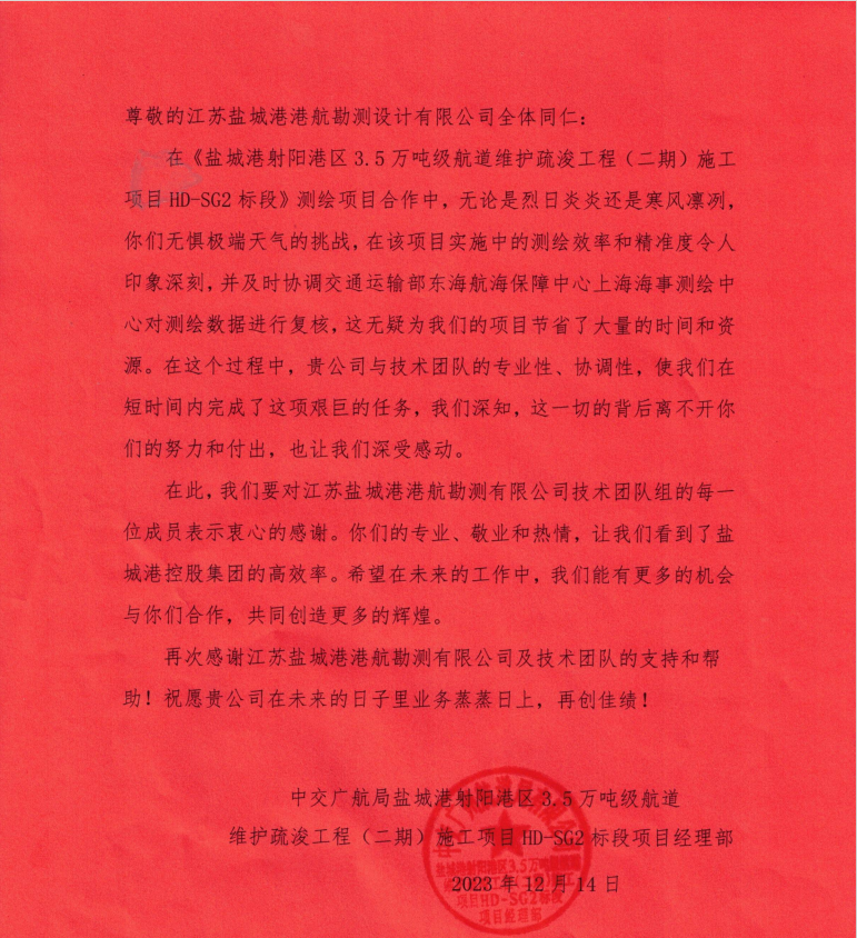 近日,a片免费看港航勘测设计公司收到来自中交广航局盐城射阳港区项目经理部的感谢信,感谢港航勘测设计公司及技术团队的支持和帮助。