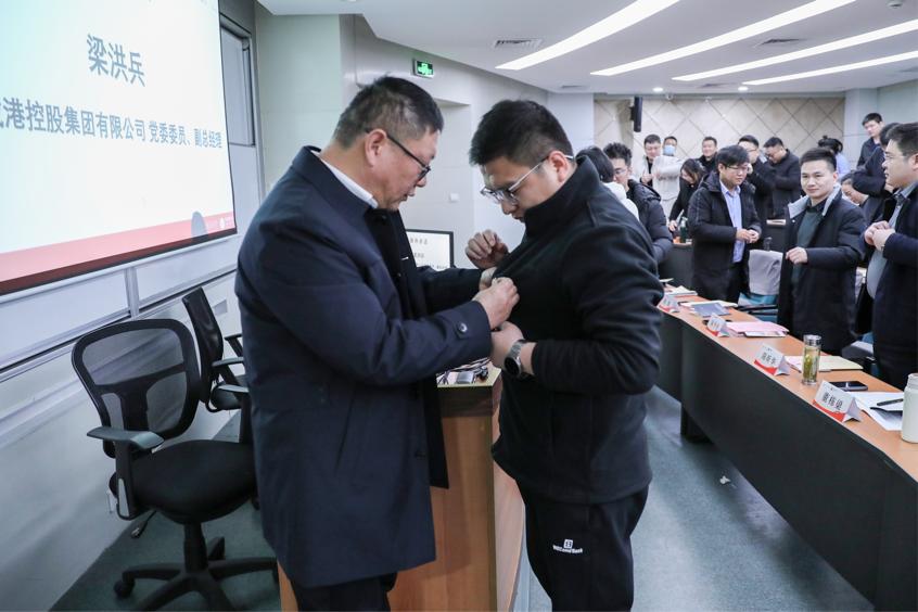 在开班仪式上,陈刚、梁洪兵亲手为学员代表佩戴上海交通大学校徽,这标志着学员们正式加入上海交通大学大家庭,开启全新的学习旅程。