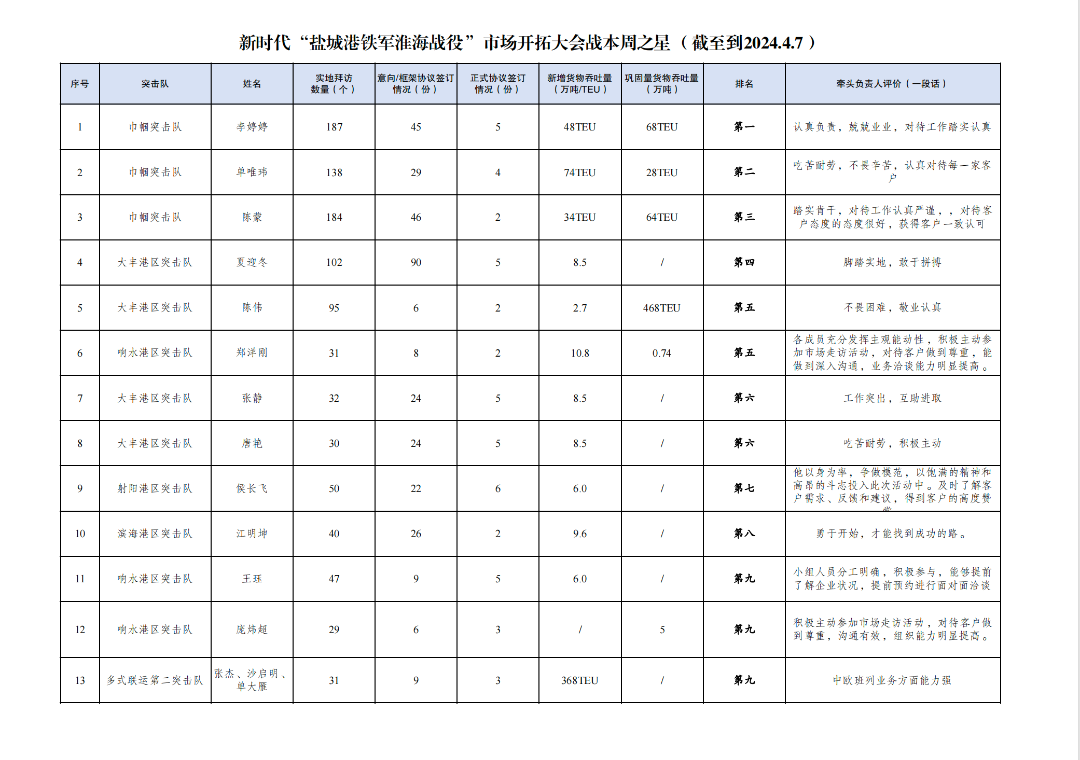 1.累计拜访客户数量3479家:其中大丰港区突击队750家,巾帼突击队293家,响水港区突击队291家,多式联运第一突击队275家,多式联运第二突击队235家,航运集团突击队232家,射阳港区突击队225家,阜宁港区突击队216家,建湖港区突击队216家,青年突击队198家,亭湖港区突击队192家,党员突击队183家,滨海港区突击队173家。
