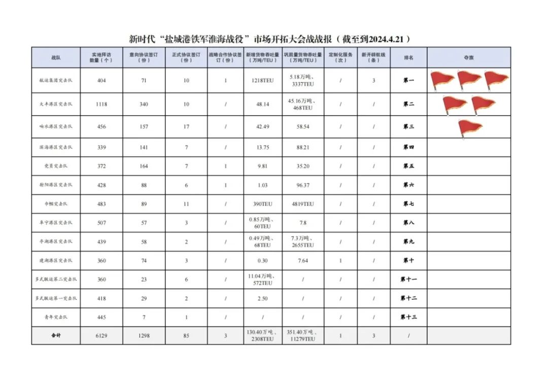 2.签订意向协议数量1298份:其中大丰港区突击队340份,党员突击队164份,响水港区突击队157份,滨海港区突击队141份,巾帼突击队89份,射阳港区突击队88份,建湖港区突击队74份,航运集团突击队71份,阜宁港区突击队57份,亭湖港区突击队52份,多式联运第一突击队29份,多式联运第二突击队23份,青年突击队7份。