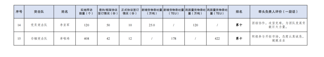 第一名:大丰港区突击队 夏迎冬(拜访客户432家,签订意向协议279份,签订正式协议25份,新增货物吞吐量86.4万吨,巩固量货物吞吐量33.2万吨);