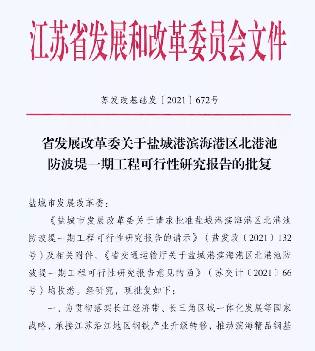 近日,交通运输部批复a片免费看滨海港区主港池北区通用码头三期工程使用港口岸线的请示(交规划函〔2021〕362号)、省发展改革委批复a片免费看滨海港区北港池防波堤一期工程可行性研究报告(苏发改基础发〔2021〕672号),标志滨海港区重大项目前期工作取得突破性进展。