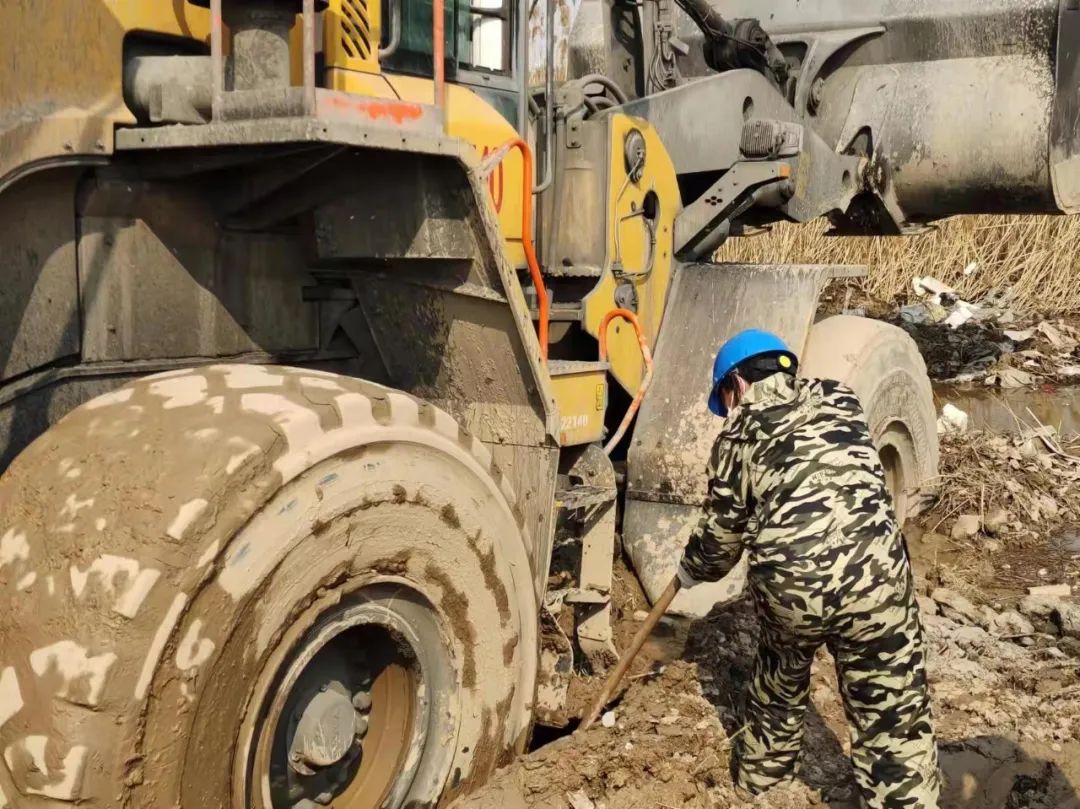 面对连续的失败,响水港区团队再次展现出了百折不挠,迎难而上的港口工匠精神,深刻剖析前两次失败原因,再次调集一台小型挖机对事件车辆轮子周边淤泥进行清理,回填石子提升其自身摩擦力,同时针对涉险装载机陷入太深可能造成底盘搁置等情况,调配一辆装载机协助抬升予以解决,并再次调集一辆装载机采用接力模式增加牵引力。经过多台机械的通力配合,受困装载机终于在拖拽中缓缓驶出泥潭,圆满完成救援工作。