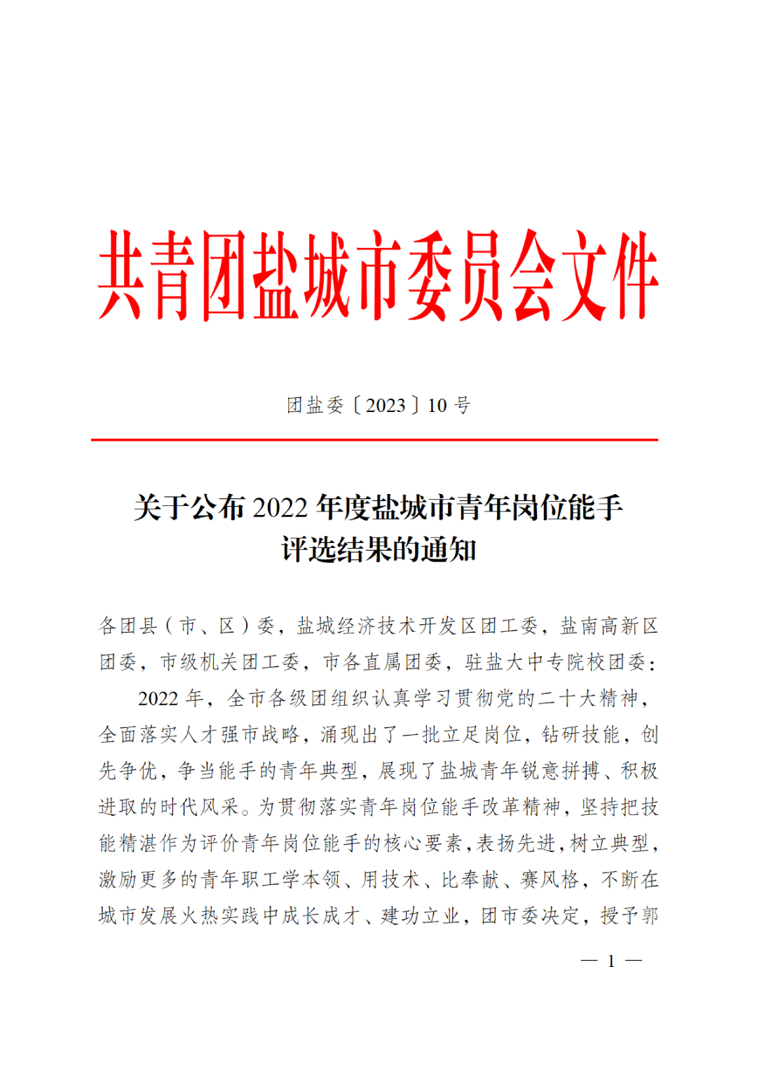近日,共青团盐城市委发布《关于公布2022年度盐城市青年岗位能手评选结果的通知》,集团丁浩明、龚海卫、李睿三名青年同志荣获“2022年度盐城市青年岗位能手”称号。