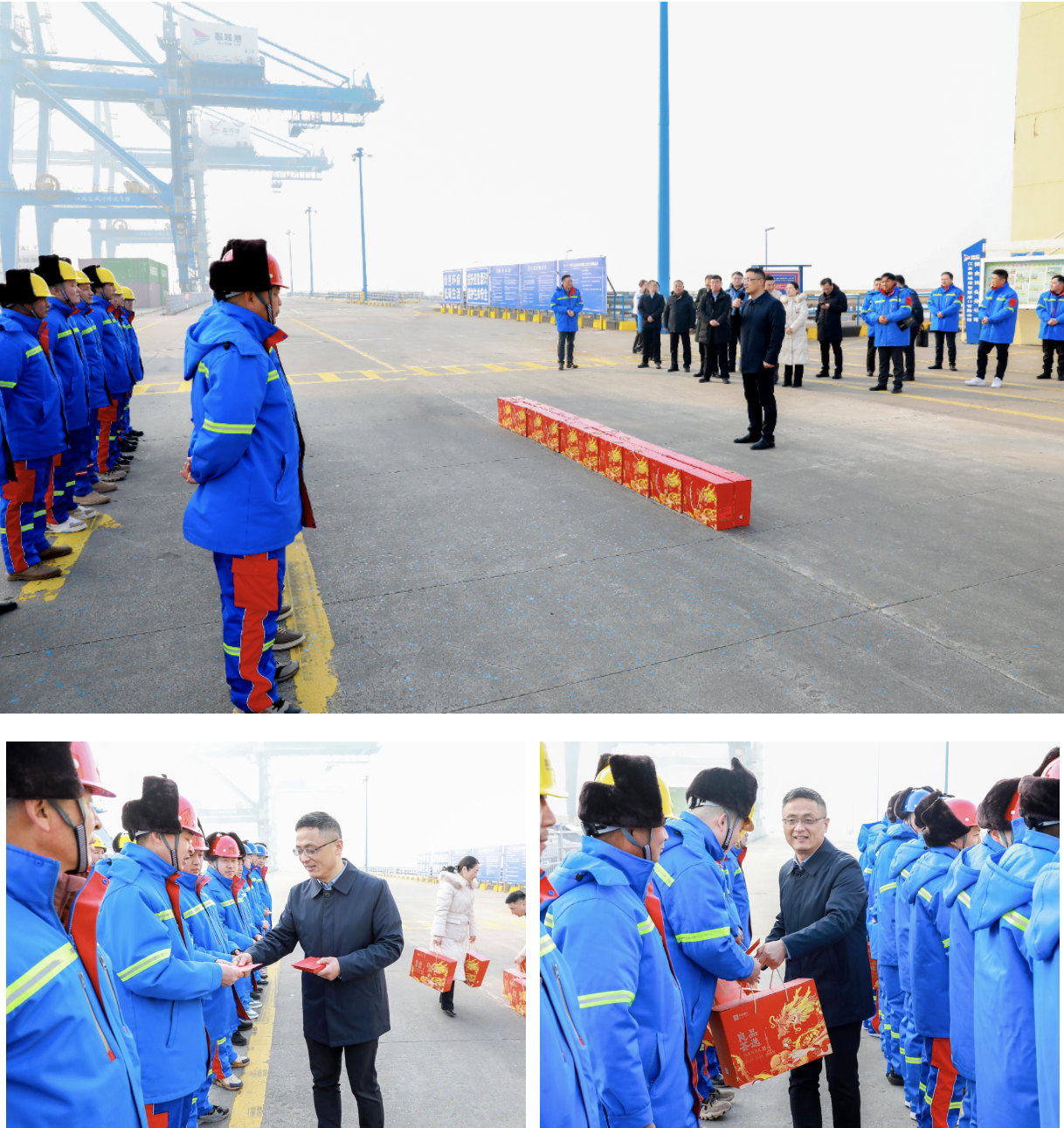 龙腾虎跃迎新春,鞭炮齐鸣庆团圆。受集团党委、董事会委托,2月10日,集团党委副书记、董事、总经理陆帅率队前往智慧港口公司粮食码头、自动化集装箱堆场和保税物流中心,看望慰问春节期间坚守在一线的干部职工。集团相关单位主要负责同志等参加。