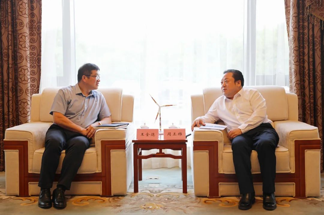 8月21日,集团党委书记、董事长周正雄会见金风科技江苏分公司总经理王全德一行,双方就开展业务合作进行交流。集团副总经理袁欣,金风科技江苏分公司及集团相关负责同志等参加。