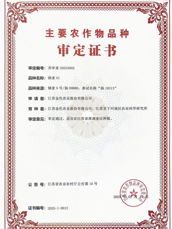 近日,江苏省农业农村厅发布第10号文件公告,宣布由江苏金色农业股份有限公司与里下河地区农业科学研究所联合选育的小麦新品种“扬麦51”正式通过江苏省农作物品种审定委员会的审定,审定编号为:苏审麦20253002。
