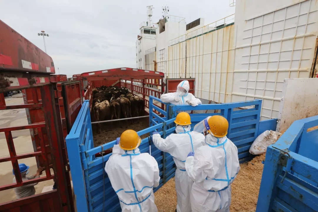 早在船舶抵港前一周,a片免费看船舶代理公司便联系各方召开了船前会,部署安排各项准备工作,及时向船方通报相关要求,同时密切关注航行动态以及活牛健康状况。到港前,正值强对流天气多发季节,码头人员密切关注天气状况,天气一经转好便联系引水拖轮,抢抓窗口期安排船舶进港,同时提前安排转运车辆消杀进港,船舶靠港后,码头工作人员认真组织防疫、消杀工作,在最短时间内完成联检工作,为活牛卸船争取了时间。