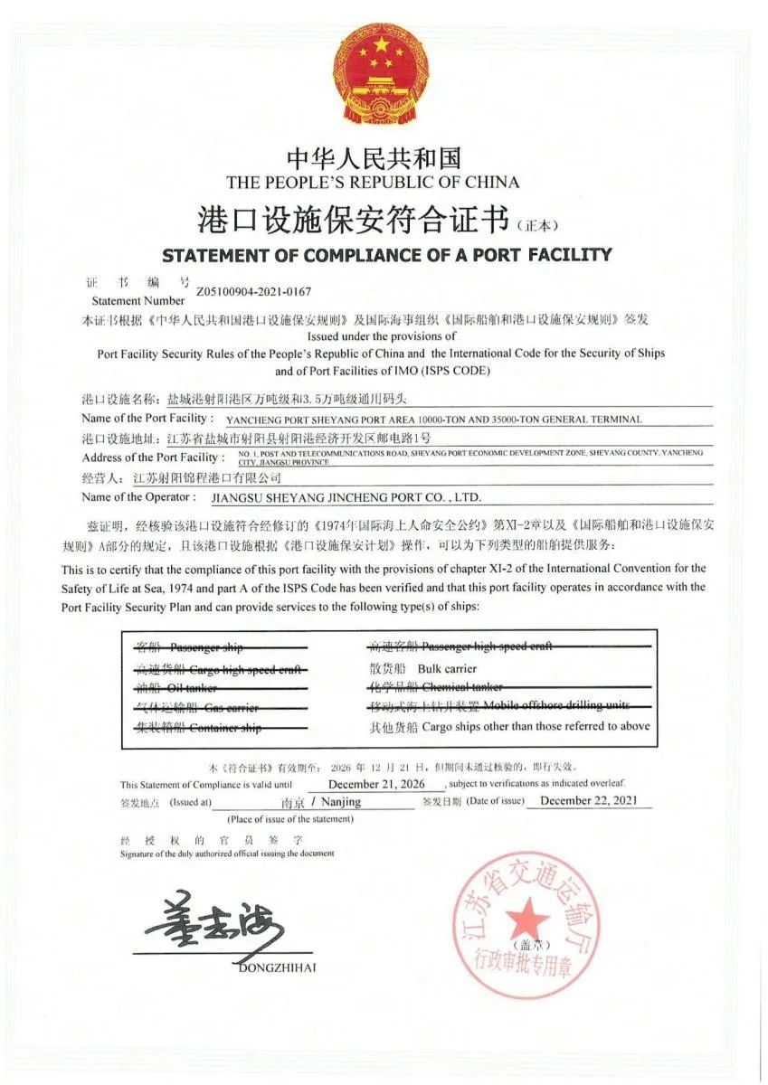 12月21日,经过射阳港区项目条线人员近三个月的不懈努力,在各主管部门和专业咨询单位的支持配合下,a片免费看射阳港区顺利取得江苏省交通运输厅核发的港口设施保安符合证书,这一证书的成功获批,为射阳港区一类开放口岸国家级验收奠定了坚实基础。