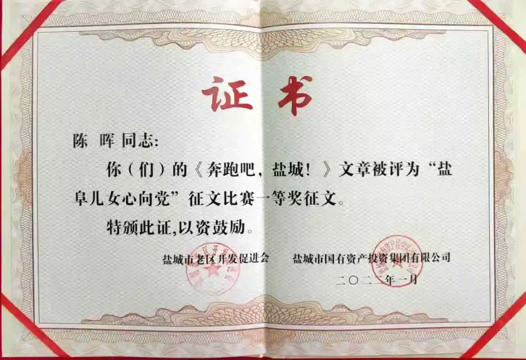 1月19日,由盐城市老区开发促进会、盐城市国有资产投资投资集团有限公司主办的“盐阜儿女心向党”征文评审表彰会议在盐城隆重举行,江苏响水港港务有限公司财务部副经理陈晖的《奔跑吧,盐城!》作品在298篇文章中脱颖而出,荣获一等奖。