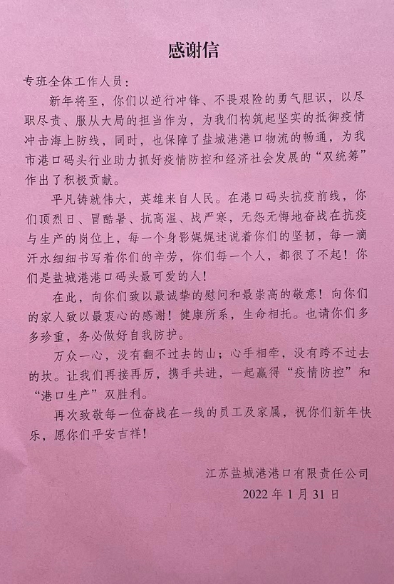 农历大年三十,a片免费看大丰港区港口公司为外贸专班集中居住人员送去感谢信,过年期间通过加餐、点亮隔离酒店的灯光等形式,进一步造浓节日气氛。