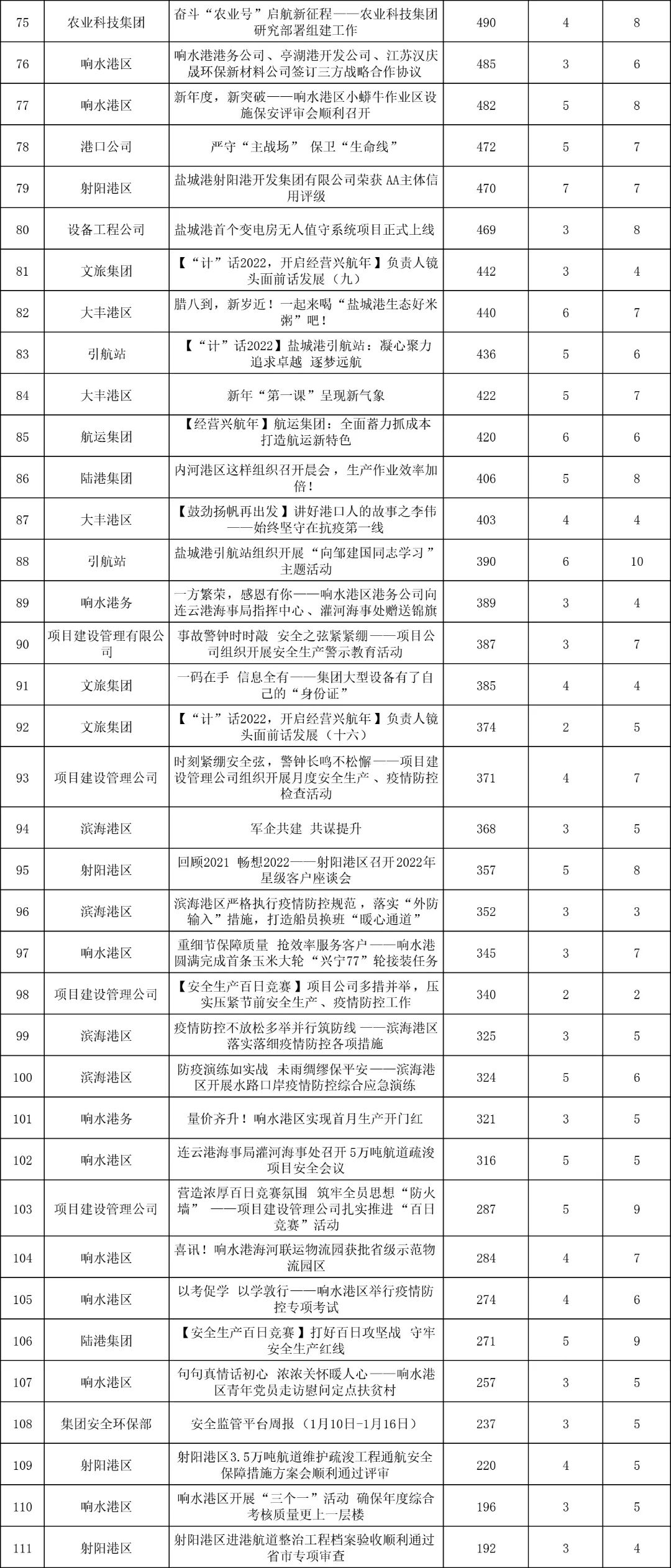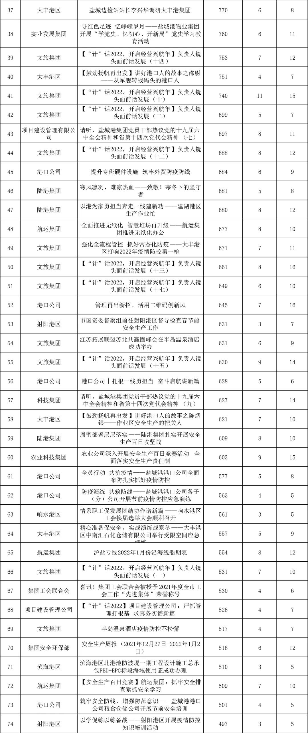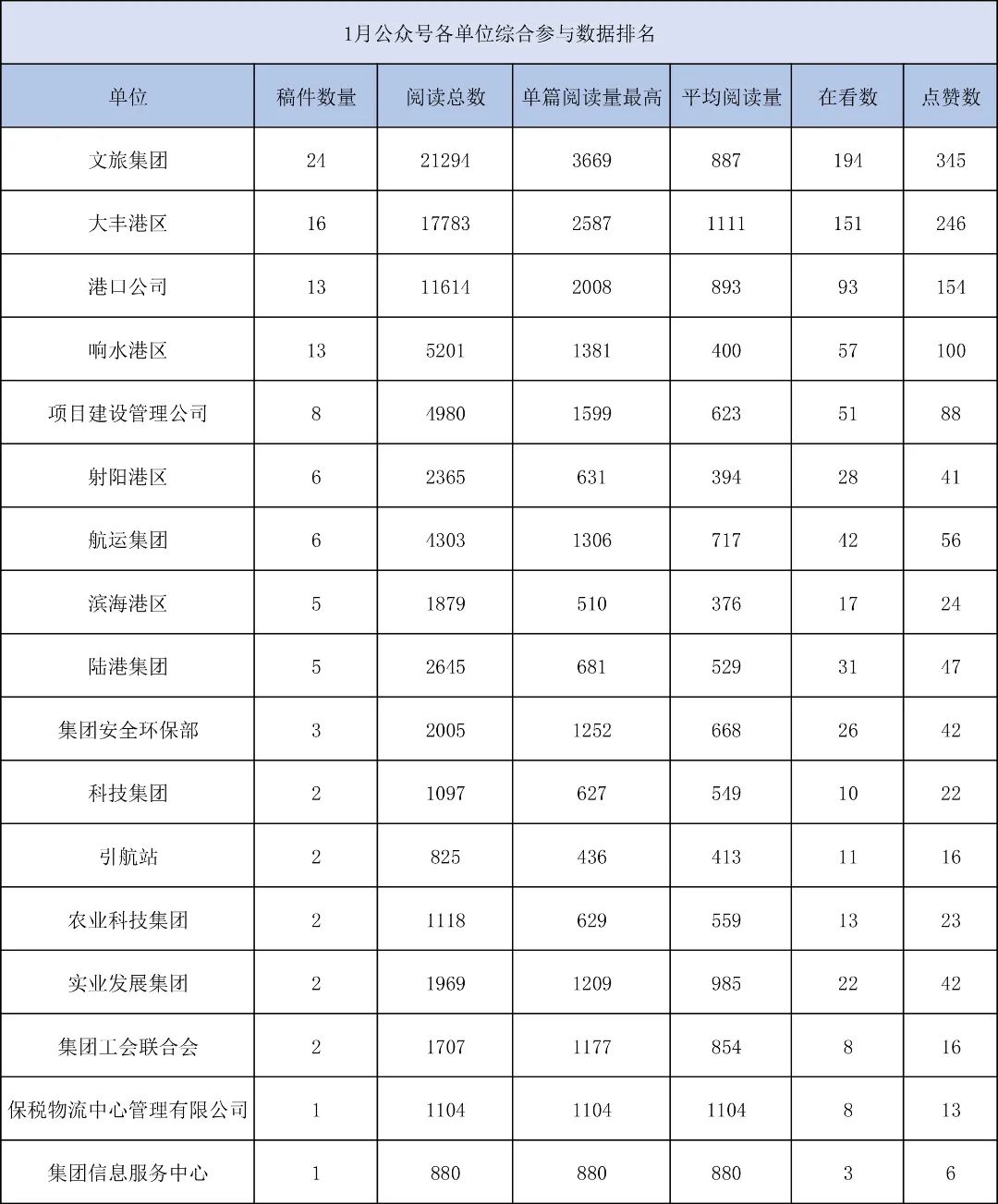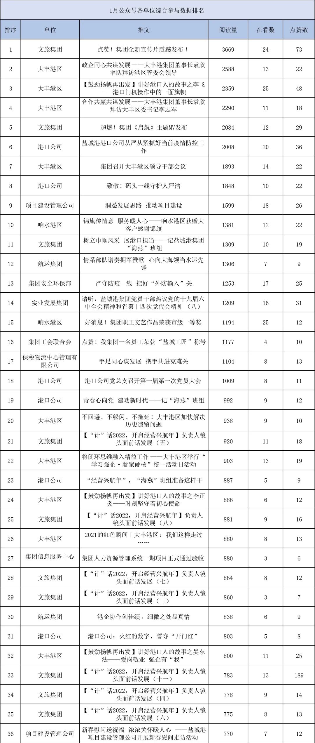1月,“江苏a片免费看控股集团”微信公众号推送文章170篇,截至目前,阅读总量14万+,各单位供稿111篇。其中,文旅集团以2.1万阅读数,24篇稿件量,遥遥领先;大丰港区以1.8万阅读数,16篇稿件量,位列第二;港口公司、响水港区在供稿方面,以同样13篇的数量并列第三,在阅读量方面,港口公司以1.2万的数量,位列单项第三;其他港口及板块集团积极参与,踊跃投稿,情况较好。