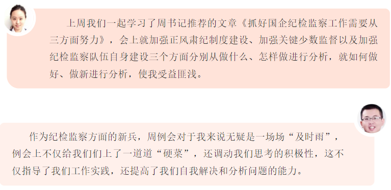 纪检监察业务周例会是大丰港区提高纪检条线工作能力的方式,也是建设学习型纪检干部的有效尝试。“学习要有干货,不能搞花架子,要了解我们的干部最需要学什么,紧贴实际需求和工作要求来安排学习内容。”大丰港区纪检相关负责人表示,深化监察体制改革,对纪检监察干部的业务能力提出了更高更严的要求,学习就是要着力补短板、强弱项,解决纪检监察干部本领“恐慌”问题。例会上,就集团纪委下发文件精神进行剖析、对日常监督如何抓、信息宣传选题立意、特色亮点提炼归纳进行培训。会上还提倡“我的问题大家答”,组织交流讨论、现场解答,鼓励善于发现问题,积极解决问题,创新理念思路,确保可以“充电补能”,提升业务能力。