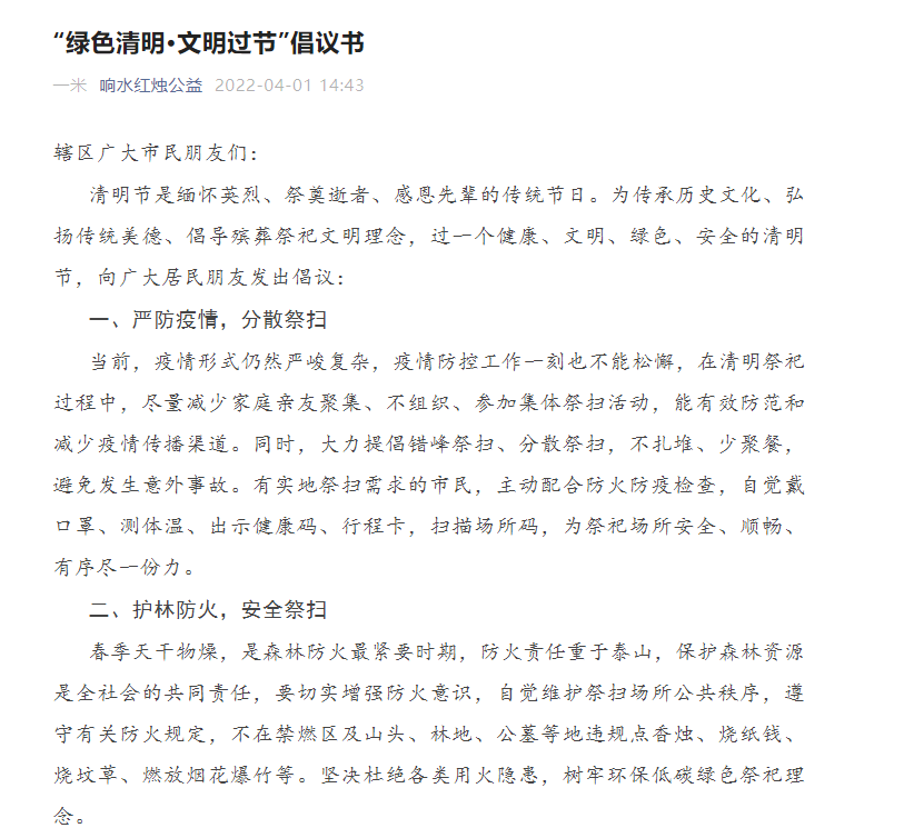 没有一个冬天不可逾越,没有一个春天不会到来。非常时期的特殊清明,坚守,就是一份力量;平安,就是一份希望。响水港区青年志愿者与您同行,从现在做起、从自身做起、从点滴做起,做文明祭扫的践行者、传统文化的传承者、告别陋习的先行者,为守护青山绿水,建设美丽港城作出自己应有的贡献。