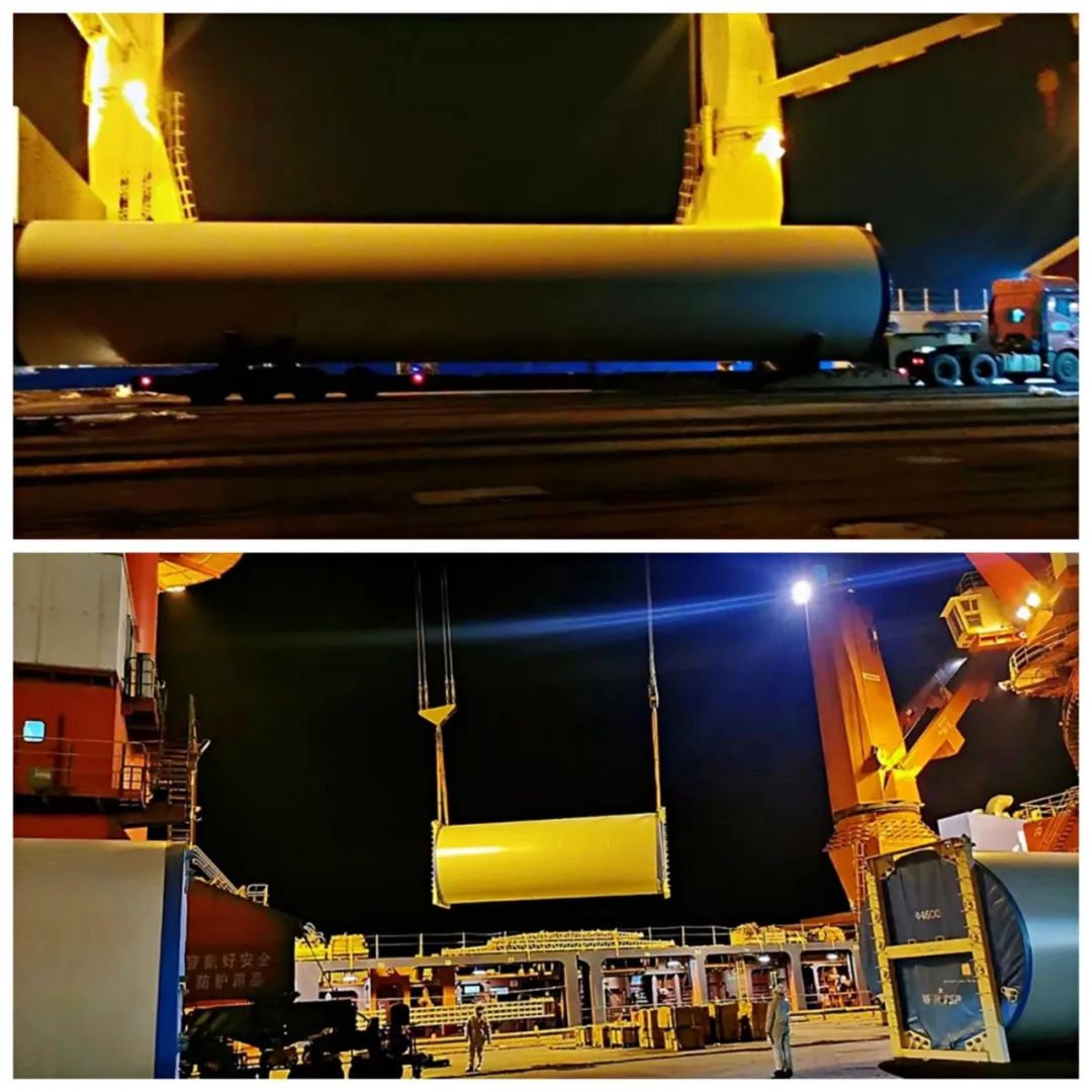目前国内新冠疫情多点散发,防疫形势严峻复杂。通用码头分公司生产经营科协同各科室,严格按照防疫要求,制定出多套卸船方案,科学调度码头人力和设备,为卸船做好充足准备。大件班组人员克服天气、环境等种种困难,针对该风电机组重量大、尺寸大的特点,利用通用码头门机紧密配合克令吊共同作战,全力保障安全生产高效有序,确保该批次风电设备顺利卸至堆场。由于风电设备对存放堆场的尺寸、荷载、坡度要求较高,既要满足风机主机对于地基承载力,还要能及时排除雨水,通用码头分公司根据风电设备组件的特殊性,对堆场进行科学划分,把同类型设备堆存在相同区域,同时也为出货时成批集中运出提供便捷。