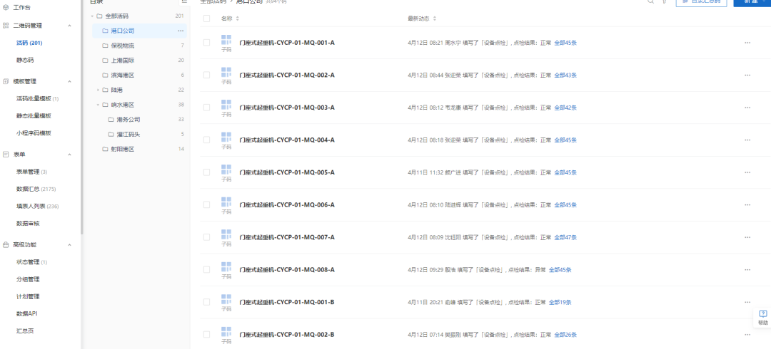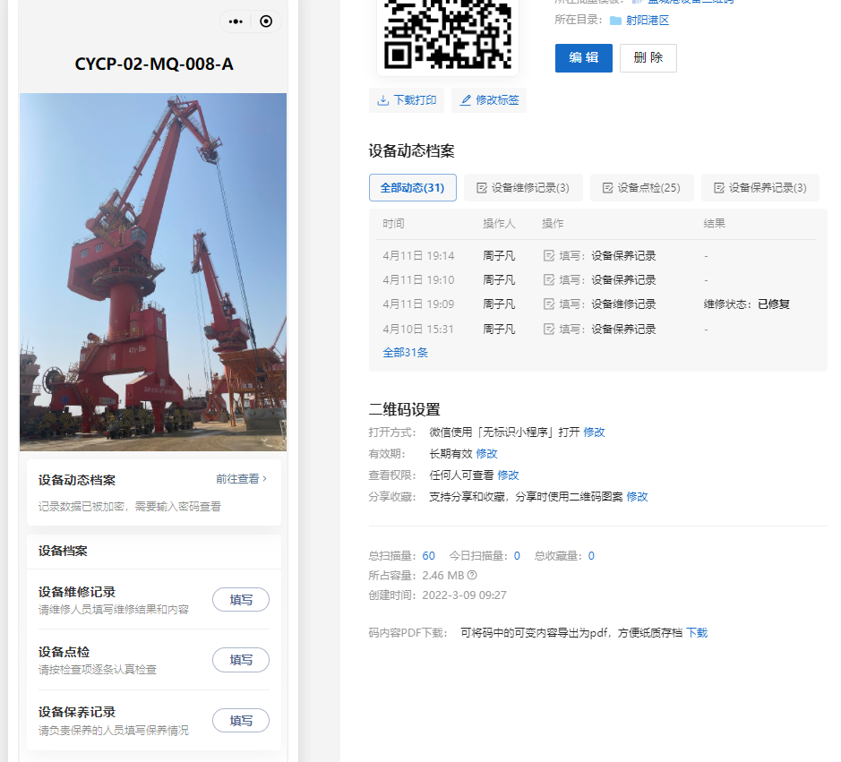现场维护保养人员通过扫描港口设备上的二维码,即可将设备维修、点检和保养记录录入设备二维码中,后台数据实时更新,管理人员可随时随地查看全集团港口设备的运行情况,实现集团集中掌握全部港口设备的运行状态,提升了设备管理效率,对出现的问题能够及时解决。同时,利用大数据汇总分析设备的整体状态,可以对设备后期的采购、维护保养提供一定建议。