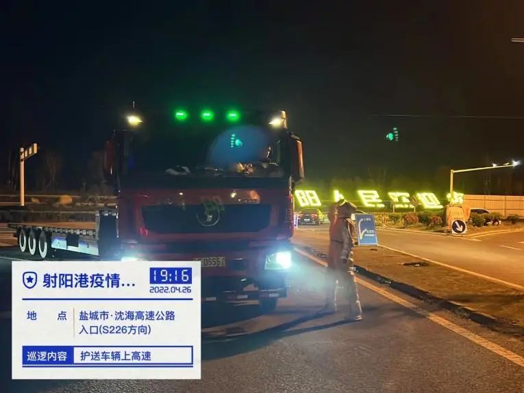 4月26日,接到客户运输车辆到达射阳高速出口检查点,请求协助的电话后,港区立刻成立专项小组穿戴好防护服至高速口开展全程配套服务,及时将运输车辆引导到港区。