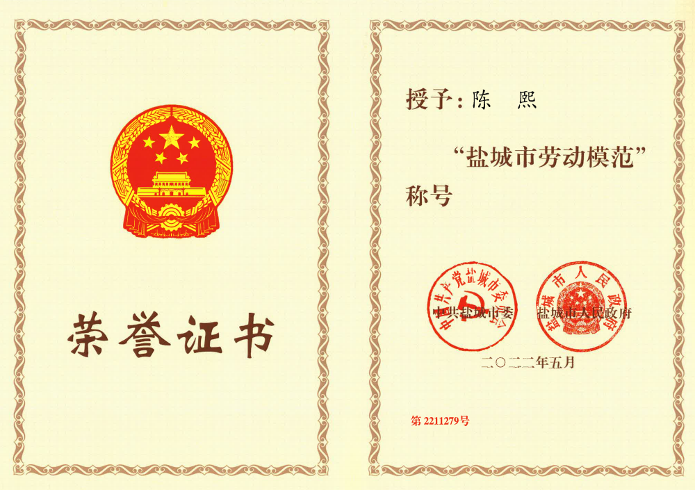 喜报丨集团陈熙同志荣获“盐城市劳动模范”称号