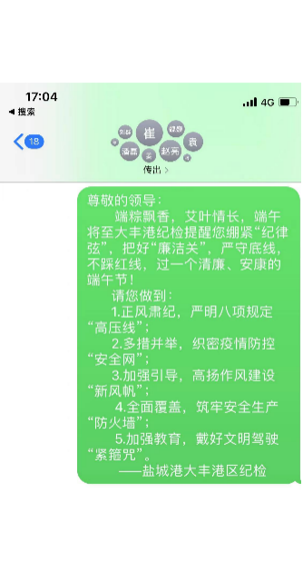 “绷紧‘纪律弦’,把好‘廉洁关’,严守底线,不踩红线,过一个清廉安康的端午节!”为进一步增强全体干部职工廉洁自律意识,a片免费看大丰港区纪检常态化开展警示教育活动,以发送廉政短信、发放廉洁提醒等形式将廉政教育抓好抓实。