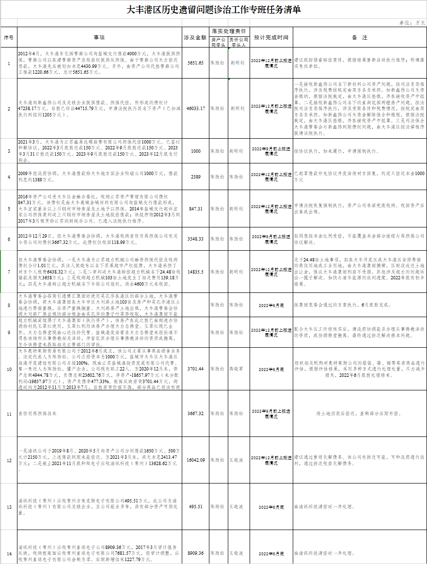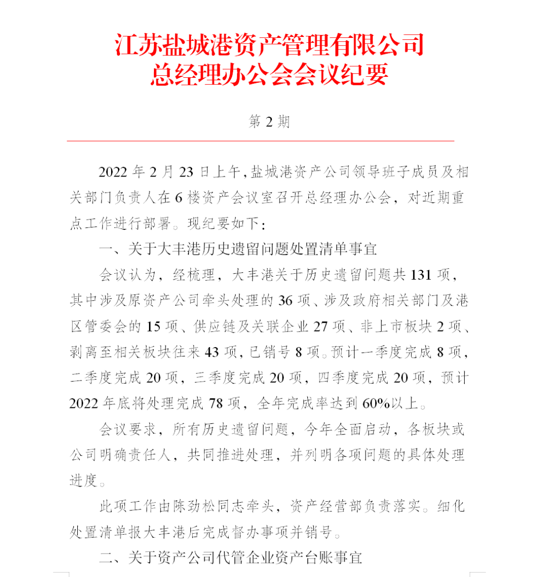 在“六清”的基础上,梳理大丰港区历史遗留问题诊治工作专班任务清单计97项,并完成任务清单说明;完成江苏大丰海港控股集团有限公司涉及“国企债券专项审计调查发现问题整改工作”,并将整改工作采取的措施和整改进展情况等形成工作报告上报大丰区国资委;共计处理处置大丰港区历史遗留有问题往来74笔,金额8.09亿元。截至5月31日已完成大丰港区历史遗留问题诊治工作专班任务清单计15项,涉及金额2.81亿元。
