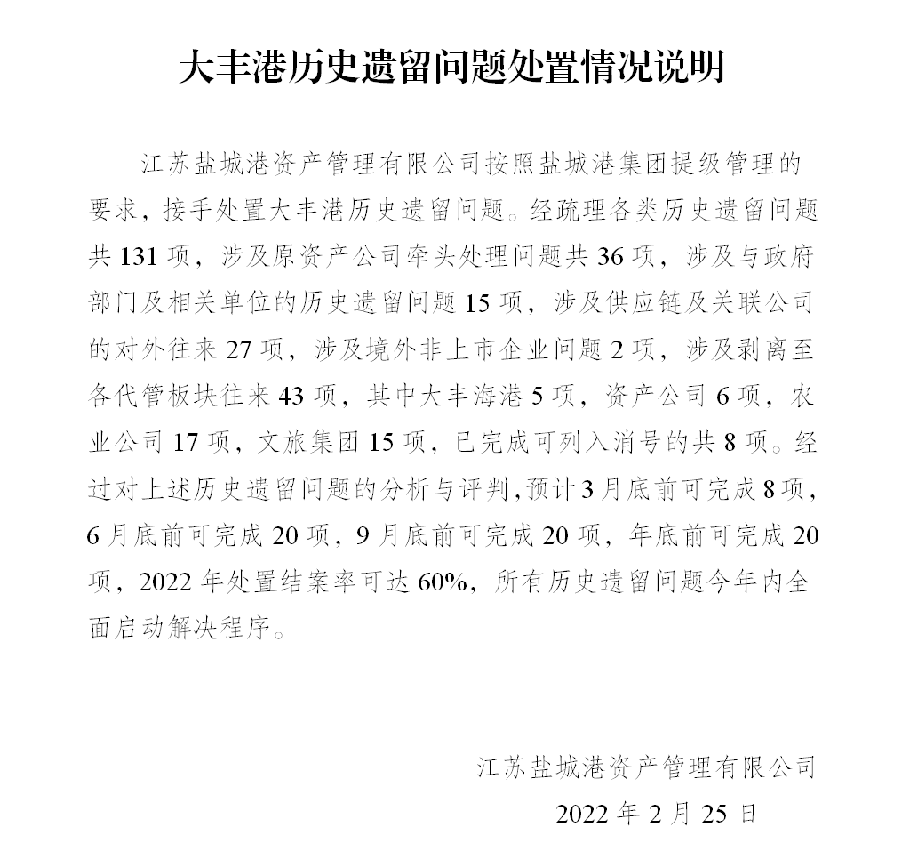 处理处置完成大丰港区闲置、低效资产2.58亿元,其中:有问题在建工程0.49亿元,有问题待摊费用0.54亿元。目前正在加快推进奥特莱斯、和顺环保科技、港鑫铜业、市民卡、水务公司、苏港包装等企业的资产处置工作。