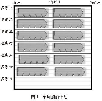 2.3 船舶泊位参数根据港口提供的实际船舶和泊位规格参数,建立船舶精确模型和简化模型,具体模型按照现场作业需求和仿真系统实际运行情况进行选择。为了对港口堆场作业进行有效的仿真分析,在设置泊位参数时,优先考虑实际作业过程中最大泊位通过能力。按照单周作业计划进行工况设定,单周计划作业船舶12艘,单艘船舶装箱量为420~ 530 TEU,卸箱量为420~530 TEU。单周船舶计划见图1。