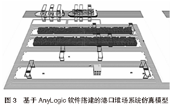 3.2 堆场仿真系统模型根据堆场仿真系统架构,以某港口自动化堆场作业的实际运行环境为基础,分别搭建基于AnyLogic软件和FlexTerm软件的港口自动化堆场系统仿真模型。基于AnyLogic软件搭建的港口堆场系统仿真模型见图3,基于FlexTerm软件搭建的港口堆场系统仿真模型见图4。
