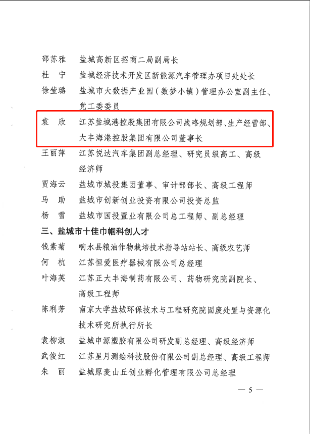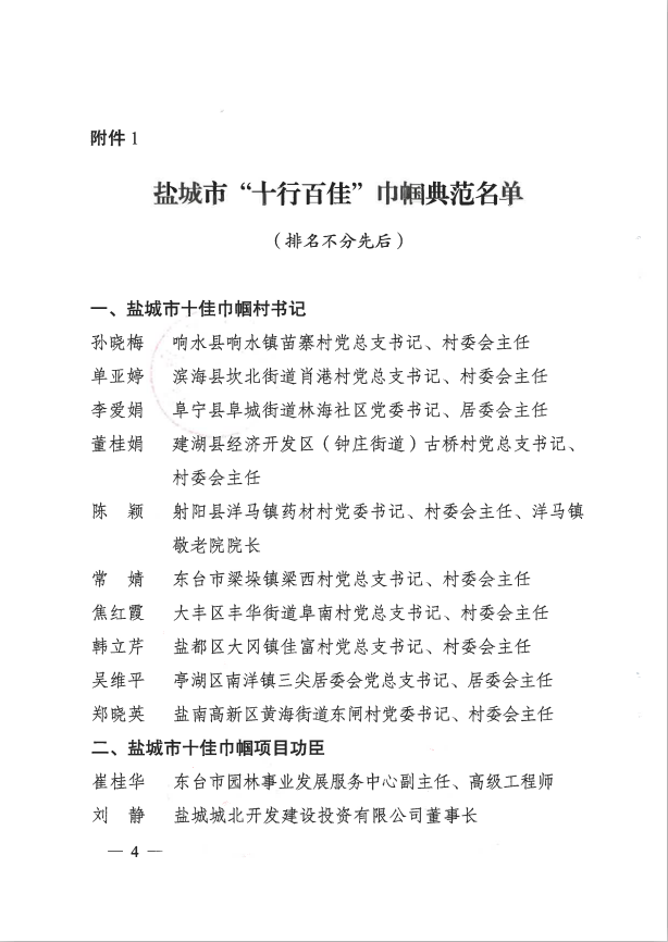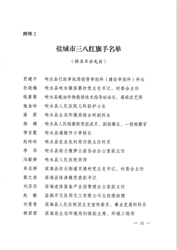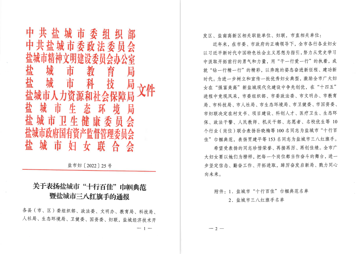 近日,盐城市妇女联合会发布《关于表扬盐城“十行百佳”巾帼典范暨盐城市三八红旗手的通报》,袁欣同志荣获“盐城市十佳巾帼项目功臣”“盐城市三八红旗手”荣誉称号。