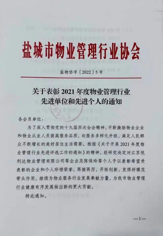 近日,盐城市物业管理行业协会对全市物业管理行业先进单位和先进个人进行了表彰,江苏a片免费看物业集团有限公司获评“2021年度物业管理行业先进单位”荣誉称号。