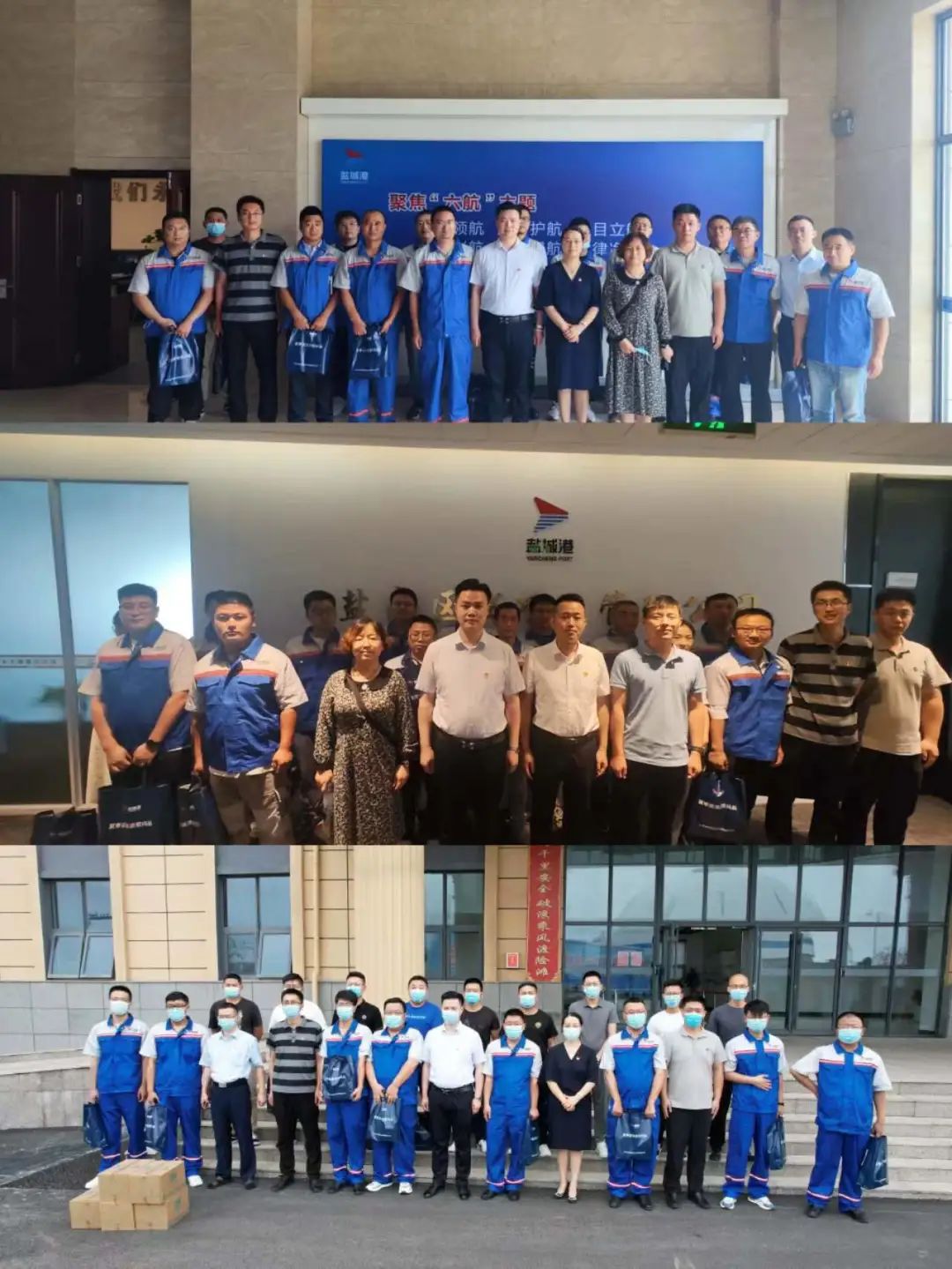 在深入基层一线现场,慰问组观摩了滨海港区U型港池项目施工现场、射阳港区3.5万吨航道疏浚工程及大丰港区工作船安保设施工程等项目现场,每到一处都仔细查阅施工时间记录及防暑降温物资发放登记表,确保每个工人都能合理安排施工作业时间,及时领取到防暑降温物资。慰问组还检查了现场施工环境、疫情防控及施工日志登记簿,详细了解各项目施工及防疫工作实施情况。