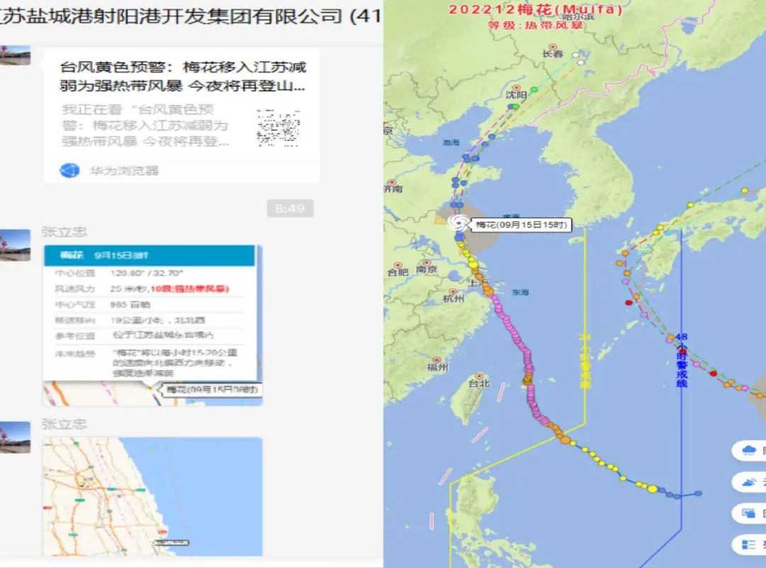 射阳港区安全环保部时刻关注台风动态,加强台风预报预警,实时发送台风路径,及时启动防风防台应急响应,做好预警响应联动与临灾“叫应”机制,确保港区平安。