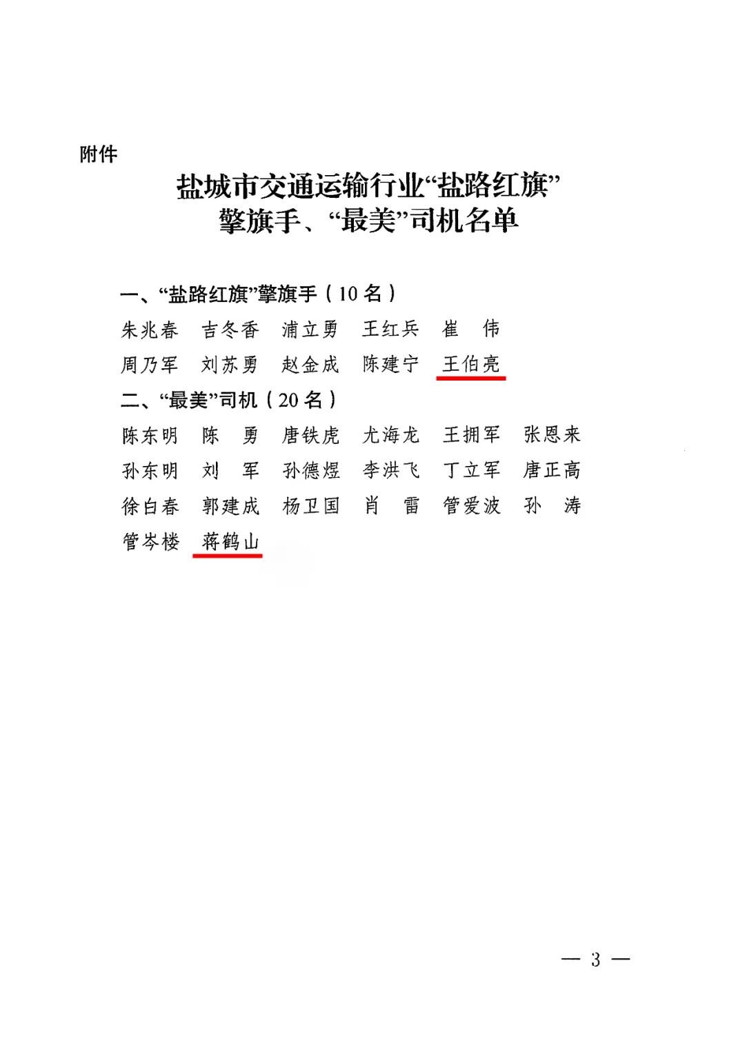 近日,中共盐城市交通运输行业委员会印发《关于表扬盐城市交通运输行业“盐路红旗”擎旗手和“最美”司机的通知》,集团大丰港区王伯亮荣获“盐路红旗”擎旗手荣誉称号,集团响水港区蒋鹤山荣获“最美”司机荣誉称号。