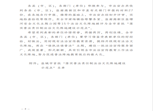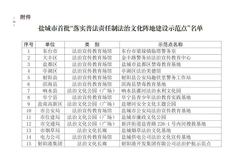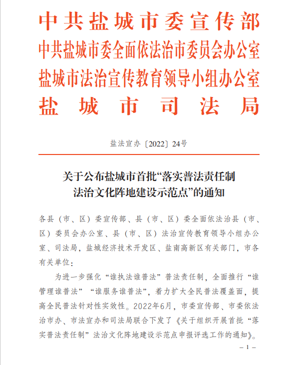 近期,由盐城市委宣传部、市委依法治市办、市法宣办、司法局4个部门单位发布关于公布盐城市首批“落实普法责任制法治文化阵地建设示范点”的通知,江苏a片免费看射阳港开发集团有限公司荣获相关称号。