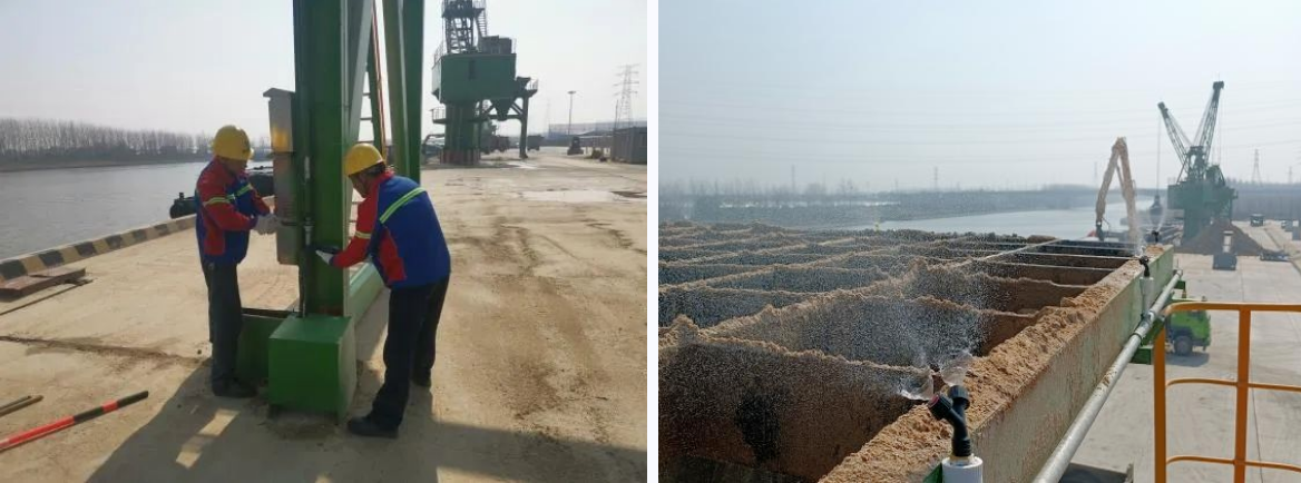 港机公司通过在设备上加装高性能微雾装置和圆锥形高压微雾喷头,来感应固定吊抓斗移动,当抓斗靠近料斗时触发距离传感器,系统自动打开喷雾,从而减少物料装卸过程中的扬尘,实现散货作业抑尘自动化。