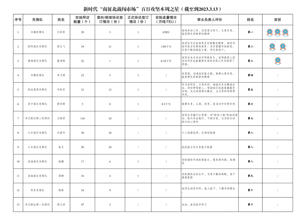 1.累计拜访客户数量1179家:其中大丰港区先锋队199家,多式联运第二先锋队192家,党员先锋队119家,响水港区先锋队99家,滨海港区先锋队97家,巾帼先锋队89家,射阳港区先锋队75家,亭湖港区先锋队63家,滨海港区先锋队61家,多式联运第一先锋队55家,青年先锋队51家,阜宁港区先锋队48家,航运集团先锋队31家。
