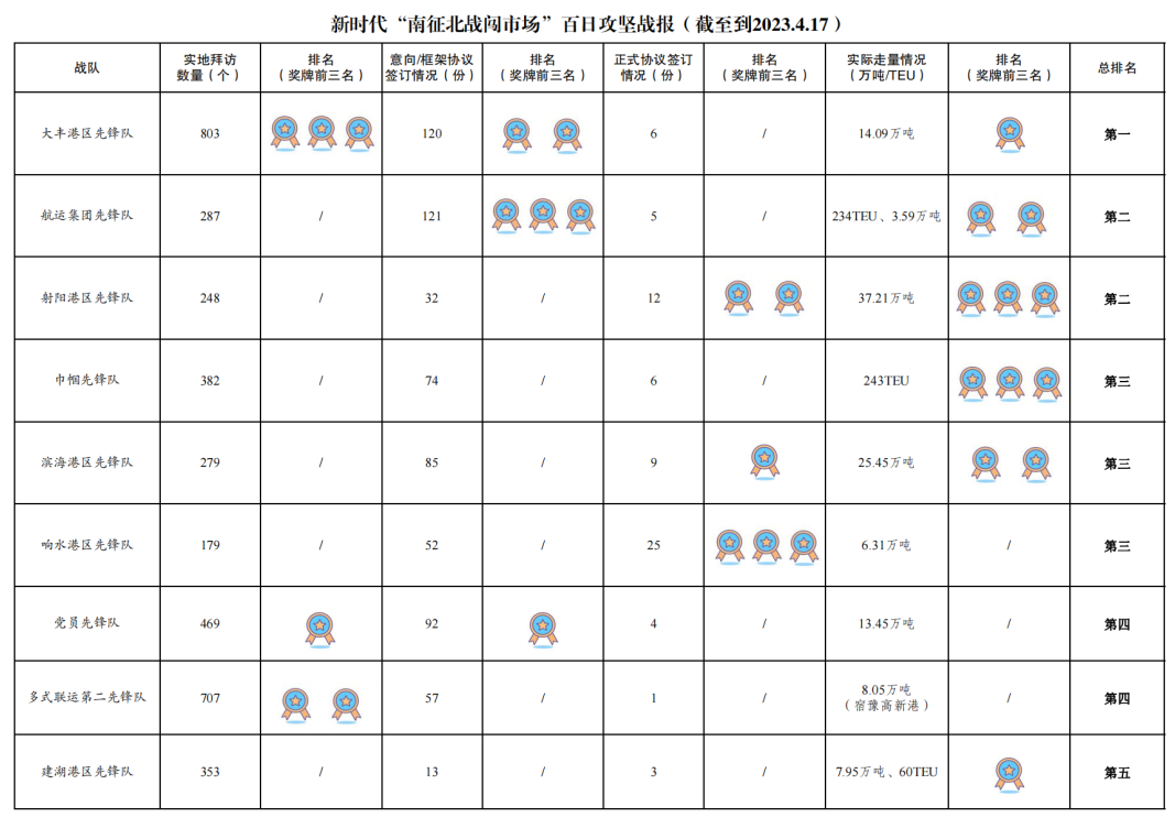 1.累计拜访客户数量4474家:其中大丰港区先锋队803家,多式联运第二先锋队707家,党员先锋队469家,巾帼先锋队382家,建湖港区先锋队353家,多式联运第一先锋队332家,航运集团先锋队287家,滨海港区先锋队279家,射阳港区先锋队248家,响水港区先锋队179家,亭湖港区先锋队166家,青年先锋队142家,阜宁港区先锋队127家。