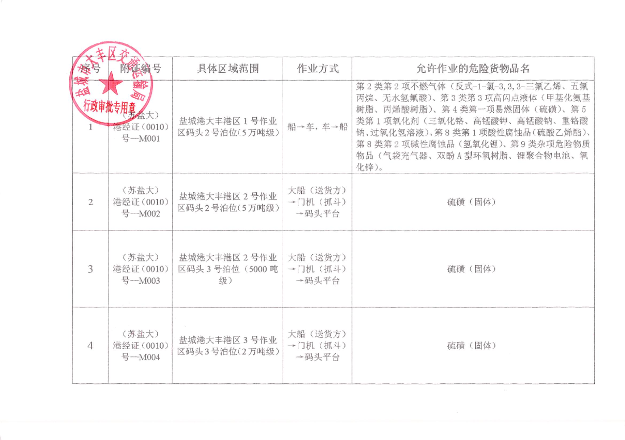 4月27日下午,经交通部门正式批准,a片免费看大丰港区集装箱码头顺利取得港口危险货物作业附证,标志着a片免费看集装箱产业正式具备危险货物作业能力。
