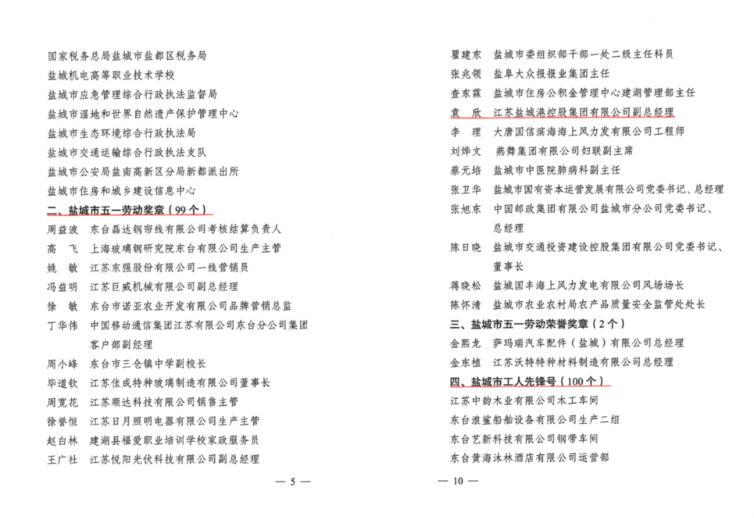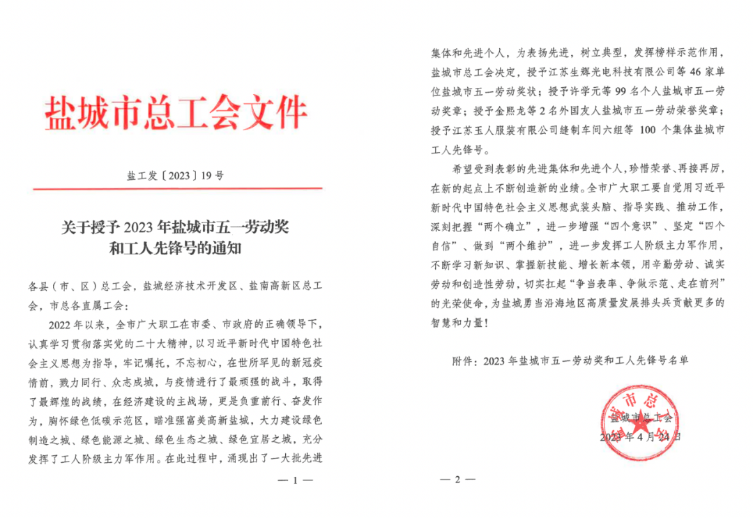 近日,盐城市总工会印发《关于授予2023年盐城市五一劳动奖和工人先锋号的通知》,我集团再获三项表彰。