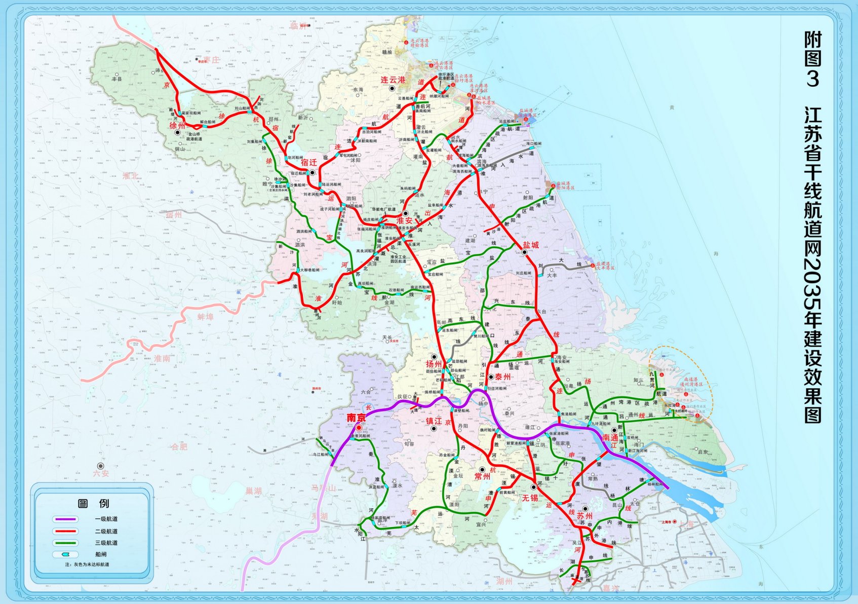 《规划》明确,至2035年,全省干线航道网规划总里程4192公里,总体呈现“两纵五横”的布局形态,形成以长江干线、京杭运河、淮河国家水运主通道为核心,二级及以上航道为主体、三级航道为支撑的“联网畅通、达海通江、优质高效、保障有力”的干线航道网络。