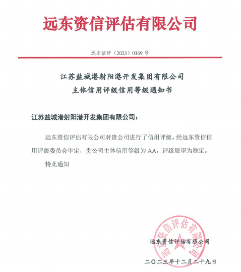 近日,远东资信信用评级委员会审定,江苏a片免费看射阳港开发集团有限公司成功获得AA主体信用评级,评级展望为稳定。这是江苏a片免费看射阳港开发集团有限公司近年来取得的又一耀眼的成绩。