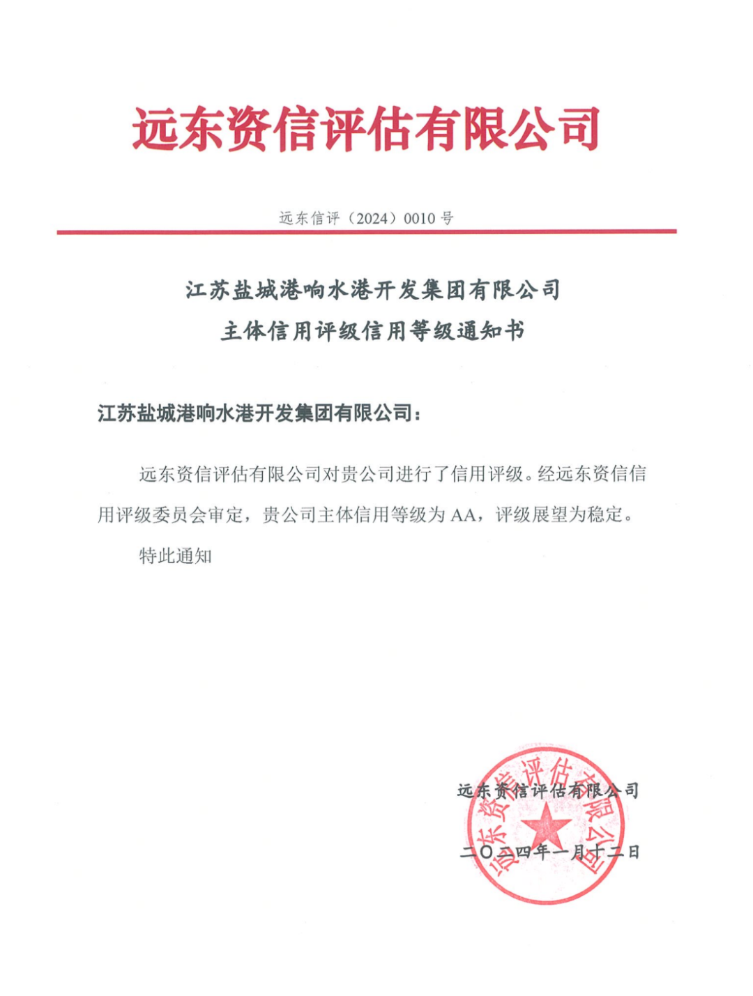 近日,远东资信信用评级委员会审定,江苏a片免费看响水港开发集团有限公司成功取得AA主体信用评级,评级展望为稳定。