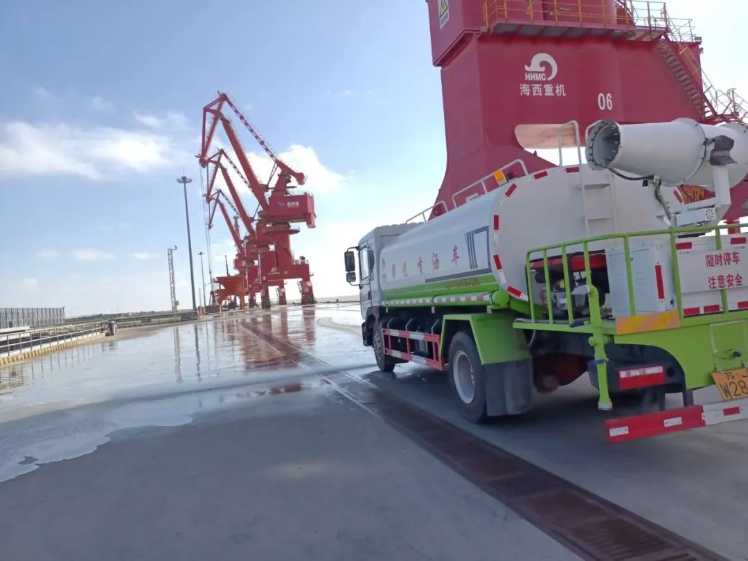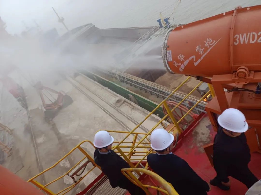 在码头散货装卸过程中实施全程水雾抑尘与作业喷淋管理;散货堆场堆码严格做到全面、及时苫盖;明确运输车辆封闭性、货物苫盖、装货高度以及车轮冲洗等规定;港区内道路全天保证完整湿式清扫4次以上,白天实行不间断洒水。确保在“生产性”扬尘形成初期,编织起一张“立体防护网”。