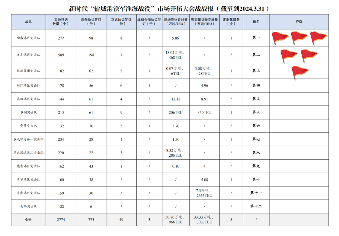 1.累计拜访客户数量2774家:其中大丰港区突击队589家,响水港区突击队277家,多式联运第一突击队234家,多式联运第二突击队220家,巾帼突击队215家,航运集团突击队182家,射阳港区突击队178家,建湖港区突击队162家,阜宁港区突击队160家,亭湖港区突击队159家,滨海港区突击队144家,党员突击队132家,青年突击队122家。