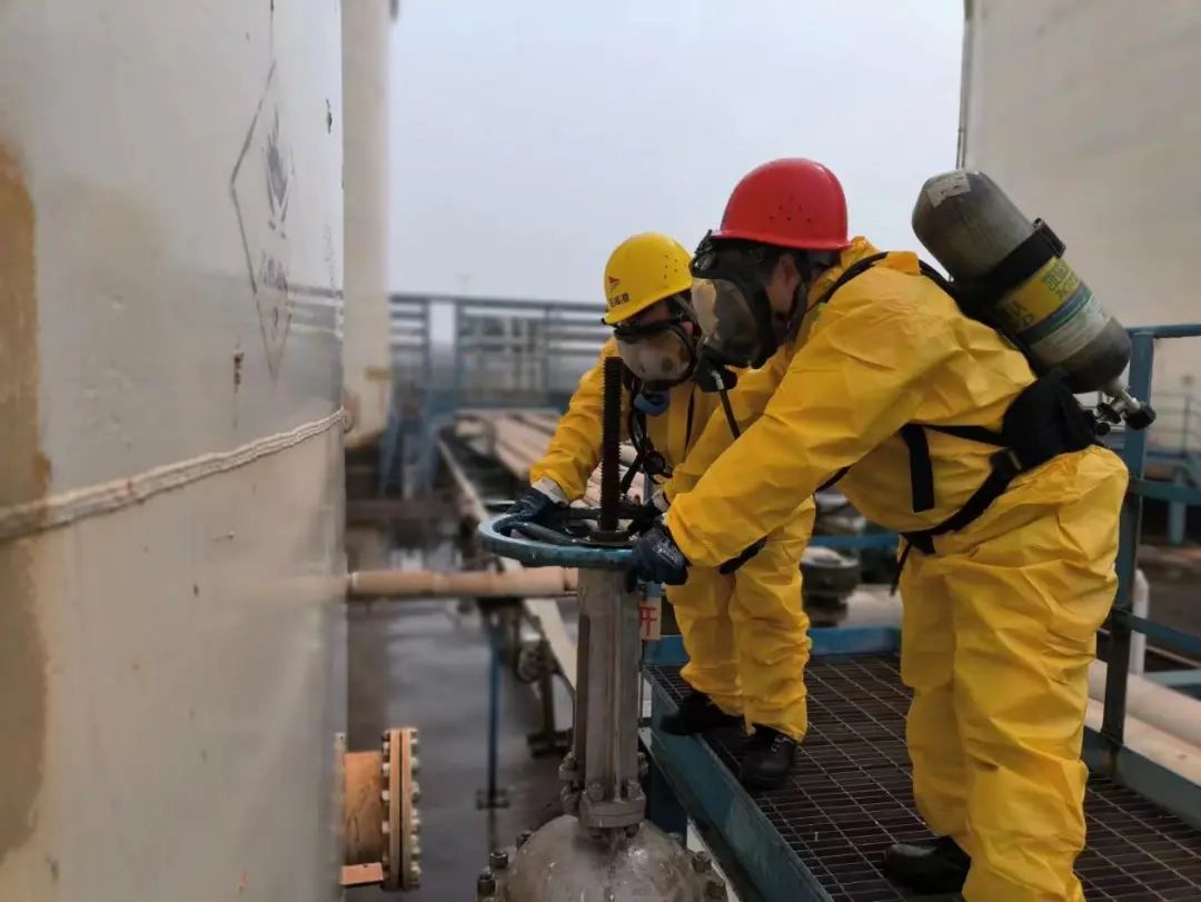通讯警戒组在安全区域拉起警戒线,救援组迅速穿戴防护用品,紧急切断TK102阀门。